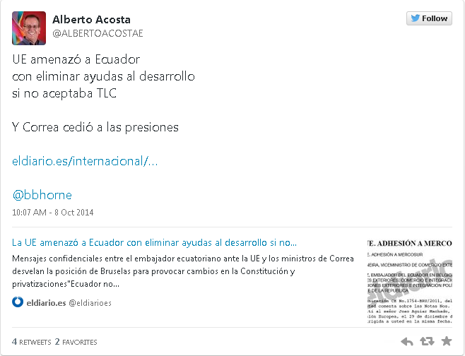 The Spanish newspaper eldiario.es bounced the leak of nine diplomatic cables, describing them as “very tense messages that reveal the European Commission’s pressure on Ecuador to change essential laws and economic policy to adjust them to a Free Trade Agreement, under the threat of excluding Ecuador from tariff aid to developing countries.”