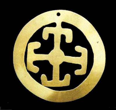 | Symbolism of possible chakanas, found on breastplates of the Cañari culture of Ecuador, registered in the book The Gold of Cuenca, Ecuador, by Marshall Saville |