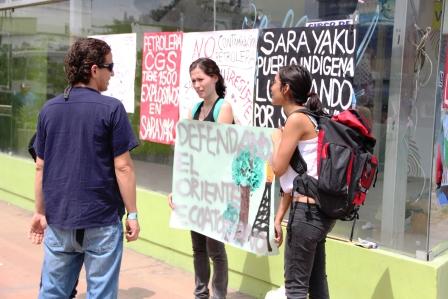 Por esta razón el dia sábado 6 de agosto iniciaron acciones informativas en un sector de la ciudad, para que la gente de las calles se interese y se informe sobre lo que realmente está pasando en el Oriente ecuatoriano, tema que en el criterio de varios activistas, no ha sido lo suficientemente difundido por los medios de comunicaciòn; para esto realizaron un plantòn en donde colocaron mapas y carteles sobre el caso Sarayacu e informaron a la gente que se interesaba al pasar por el lugar donde se realizò la actividad.