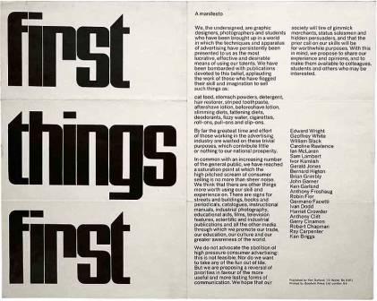The First Things First Manifesto (El Manifiesto Lo primero es lo primero) fue escrito originalmente en 1963 y causó mucho revuelo en su época. Atacaba a la cultura consumista que sólo se interesaba por comprar y vender cosas, y reivindicaba la dimensión humanista del diseño gráfico.