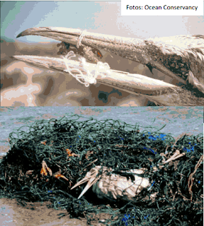 Según Greenpeace, existen registros de enredos en 56 especies de aves marinas y costeras, siendo los más comunes los pelícanos y alcatraces, seguidos de gaviotas, albatros, petreles y pardelas.