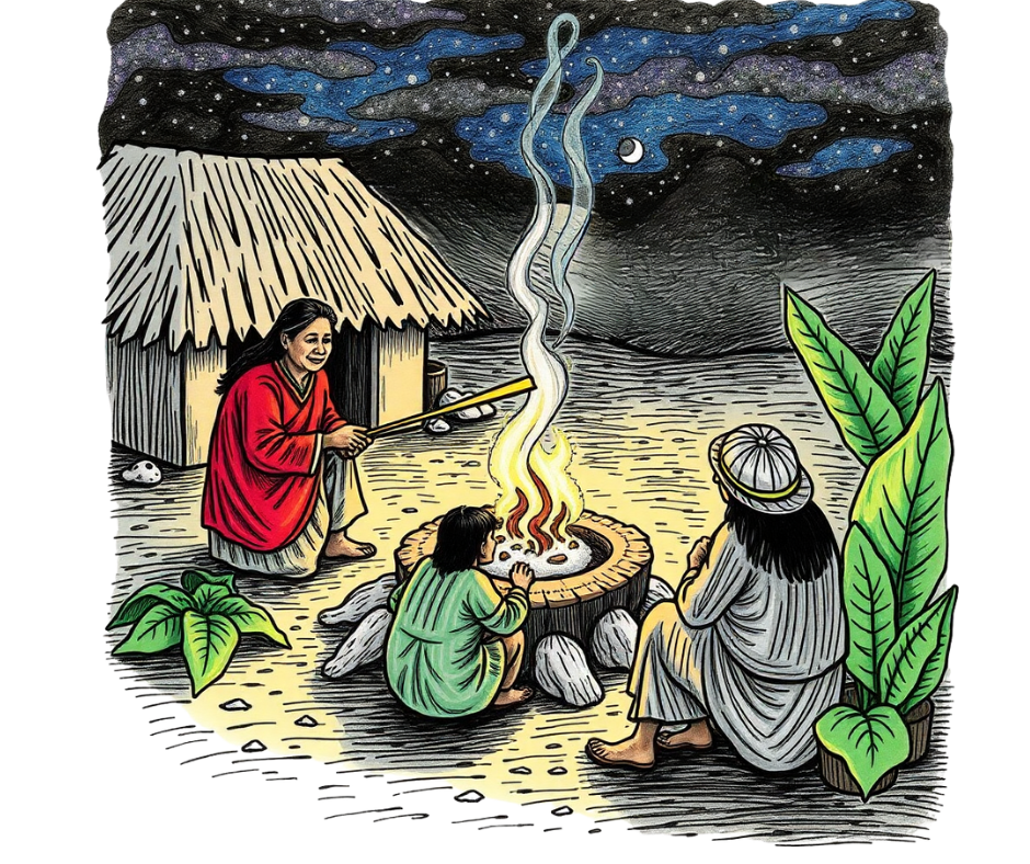 Otro participante de este encuentro, acomoda una estera tejida; otra persona, ajusta una atadura del techo de palma; para que el humo suba en hilos y no arda. Las casas alrededor son livianas y firmes: por dentro es un entramado de caña, cubierto por barro que se amasa con agua y paciencia. Si el viento arrecia o la tierra tiembla, la casa acompaña el movimiento; y después, se repara con lo que da el territorio de vida. Nada sobra, nada falta.